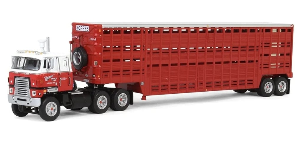 First Gear DCP 1/64 International TranStar COE w/ 45ft Wilson Trailer Tandem Axle Livestock Trailer – Koppes Truck Line (69-2028)