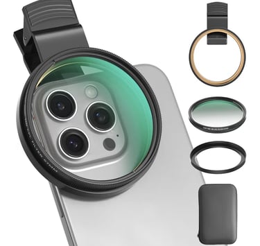 Includes a universal clip and adapter ring for iPhone, Samsung Galaxy, Pixel, and DSLR cameras.