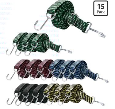 The set includes 15 adjustable bungee cords with a length of up to 80 inches, offering flexibility for different needs.