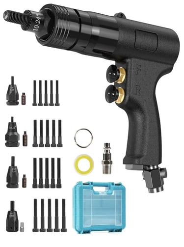 The 4-IN-1 Pneumatic/Air Rivet Nut Gun Set is a professional tool for quickly and efficiently installing Nutsert bolts in industrial or maintenance projects. It delivers reliable, precise performance, saving time and effort when working with metals, wood, or other materials.