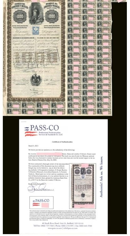 Banco de Londres y Mexico – 1,000 Pesos Stock Certificate (1905 Dated) Featuring Queen Victoria, With Dividend Coupons Attached – Uncanceled