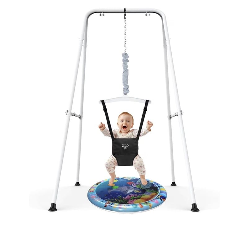 This baby exerciser is designed for easy setup and can be moved when needed. The jumper seat allows babies to bounce and move their legs while remaining supported by the frame. A water play mat is also included, which can offer an additional sensory activity during playtime.