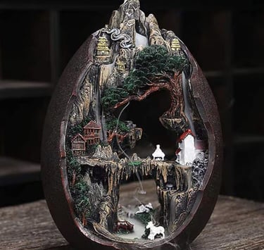 The Mountain Waterfall Backflow Incense Burner is a decorative home piece designed to create a calming visual atmosphere using backflow incense cones. Its mountain and river-inspired design allows smoke to flow downward like a waterfall, adding a relaxing visual effect to indoor spaces.