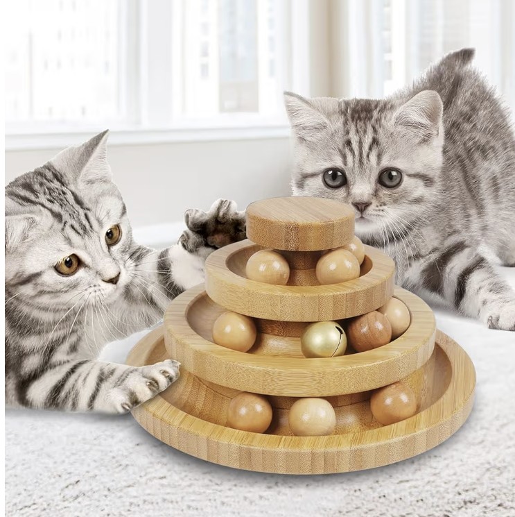 It features a 3-level circular track design with rolling balls that move when touched, encouraging cats to play and stay active.
