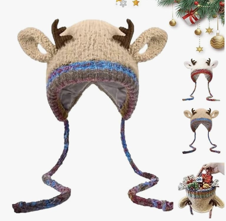 The hat features fun knitted antlers, adding a whimsical and cheerful holiday vibe. It’s perfect for women looking to stand out during celebrations, whether at parties, gatherings with friends, or as a unique and practical gift for holiday enthusiasts.