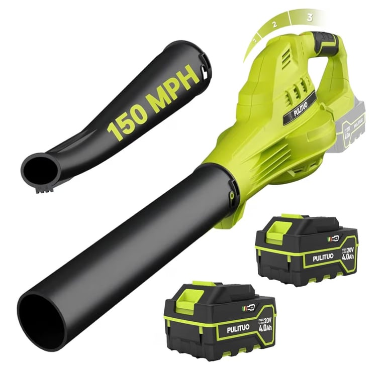 PULITUO Cordless Leaf Blower – 150MPH Lightweight Blower with 2×4.0Ah Batteries, 3 Speeds for Lawn, Patio & Yard Cleaning
