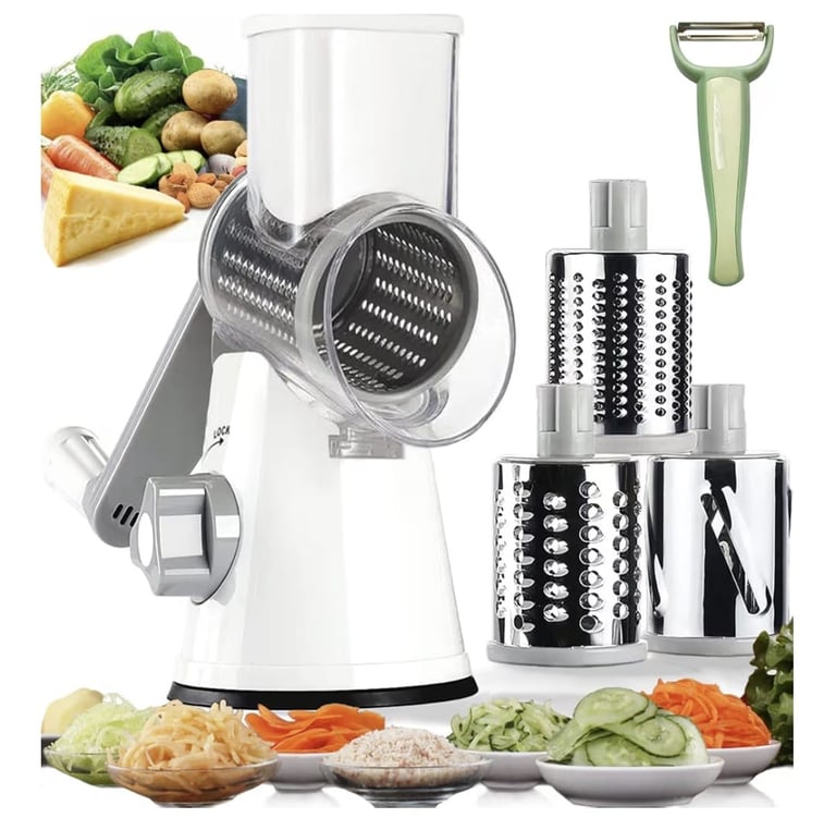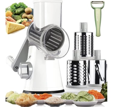 Make your kitchen prep quick and easy with this Handheld Rotary Grater Shredder. Equipped with three interchangeable stainless steel drum blades, it’s perfect for shredding cheese, slicing vegetables, grating nuts, and much more — all by hand without electricity.