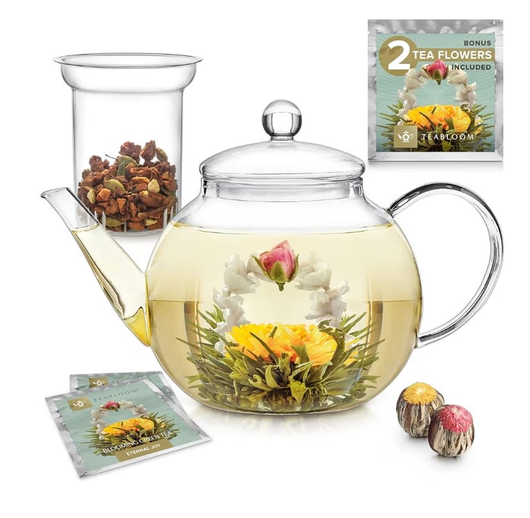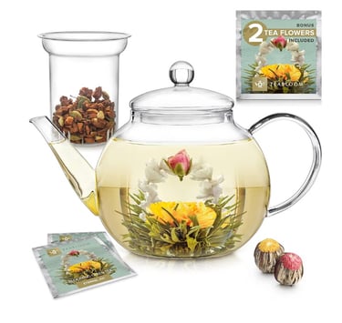 eabloom Glass Teapot – Stovetop & Microwave Safe with Removable Infuser, Includes Blooming Teas, 2-in-1 Tea Maker for Tea Lovers