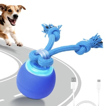 The Interactive Dog Toy is designed to stimulate movement and fun, featuring a touch-activated bouncing ball with a rope for chewing and play.