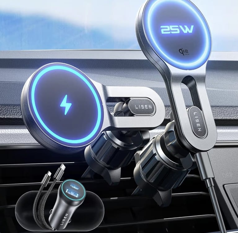 The LISEN Qi2.2 25W MagSafe Car Mount Charger is the perfect solution for keeping your phone charged safely and quickly while driving. Featuring a strong magnetic mount, it keeps your phone securely in place, preventing slips or vibrations even on bumpy roads.
