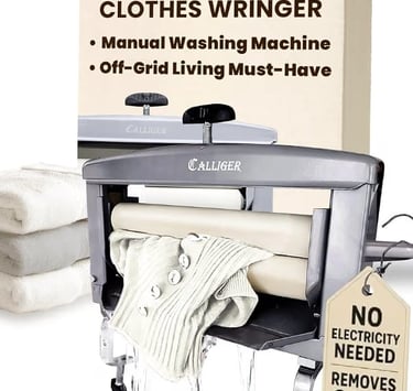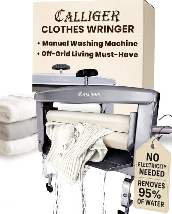 The device features sturdy, efficient rollers to press water out of clothes easily. It is ideal for off-grid use or for anyone looking for a simple, energy-saving alternative.