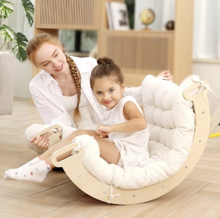 Made from durable wood with colorful rainbow design, it adds a playful touch to any kids’ room while encouraging exploration and interaction. It also includes a soft cushion, providing extra comfort when used as a rocker.