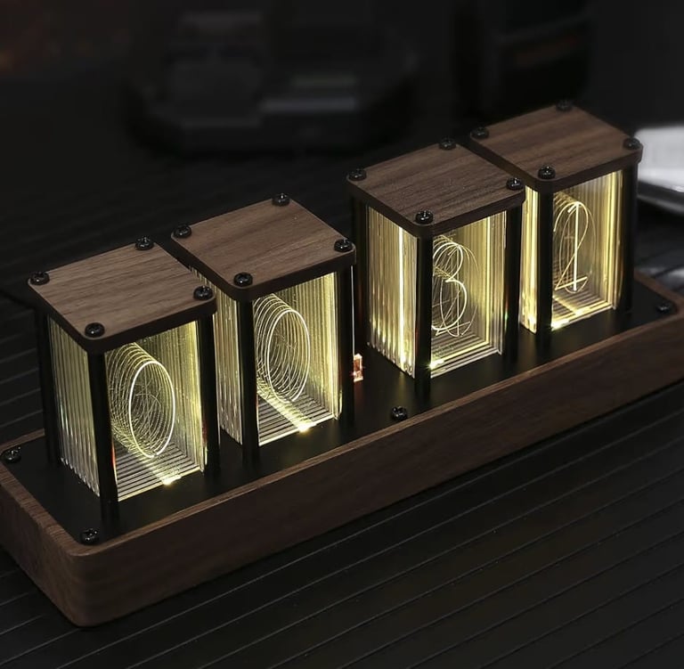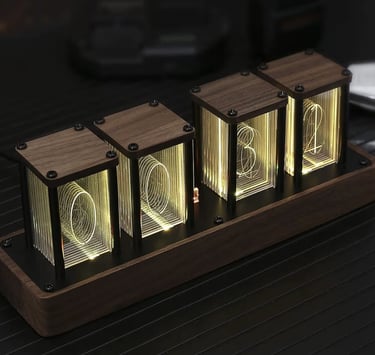 The Nixie Tube Clock in Walnut offers a unique combination of classic style and modern technology. The clock displays time using illuminated Nixie tubes, giving it a retro aesthetic, while Wi-Fi time sync ensures accurate timekeeping without manual adjustments.