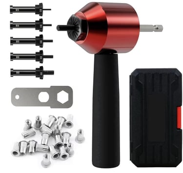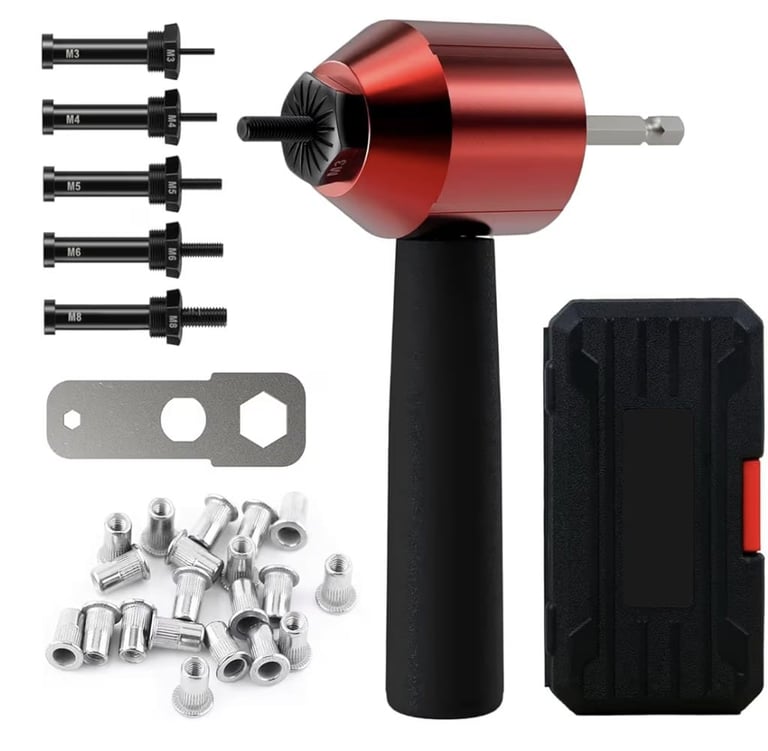 The set includes drill adapters for M3, M4, M5, M6, and M8 sizes, making it suitable for a wide range of projects involving metal, wood, or plastic. Made from high-quality aluminum, the kit ensures durability and long-lasting performance, allowing for quick and efficient rivet nut installation without extra tools.