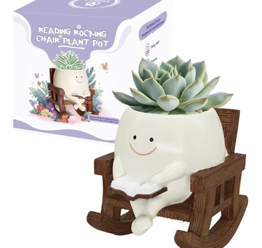Smiley Face Planter Pot – Cute Reading Rocking Chair Plant Pot for Succulents with Drainage Hole, Unique Indoor Outdoor Plant Decor Gift for Mother’s Day & Christmas