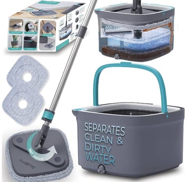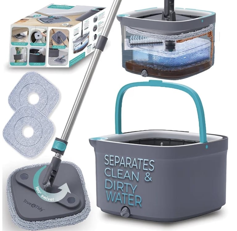 The True & Tidy True Clean Spin Mop & Bucket System provides a practical and efficient solution for cleaning floors with ease. Its dual-compartment bucket design separates clean and dirty water, helping maintain cleaner water during the mopping process.