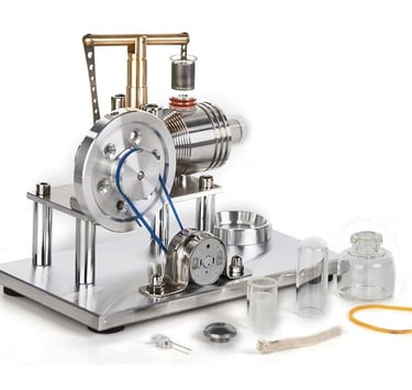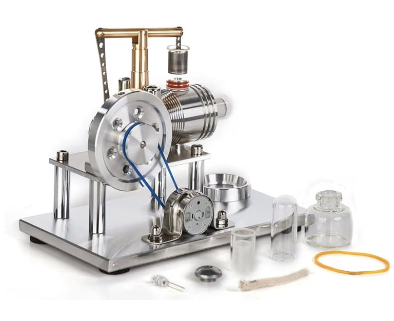 This model operates using the Stirling engine principle, which works based on temperature differences. When the base is heated, the piston begins to move, causing the flywheel to rotate and generate small mechanical energy that can power a colorful LED light.