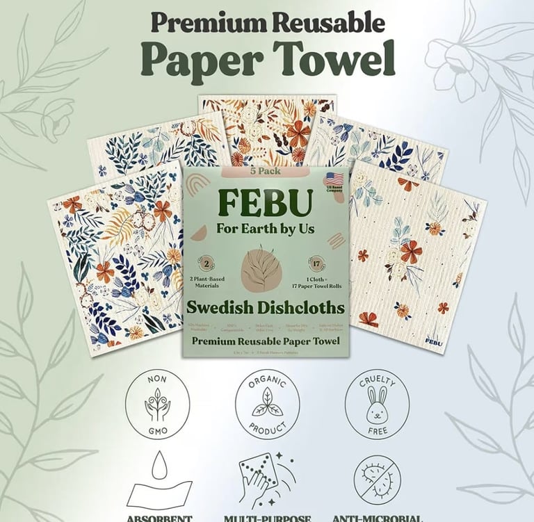 FEBU Swedish Dishcloths 5 Pack – Reusable, Washable, Non-Scratch, Biodegradable Kitchen Cleaning Cloths
