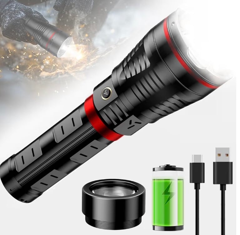 The SKYFIRE High Lumens Rechargeable Flashlight is a powerful lighting tool designed for outdoor use, offering strong illumination with a large rechargeable battery suitable for camping and emergencies.