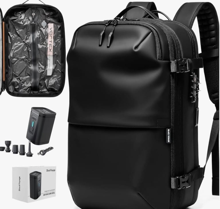 BlackVoyage Vortex Vacuum Seal Travel Backpack 60L β Expandable Air Compression System, Water Resistant, TSA Lock Carry-On Luggage, Vacuum Pump Included, Black AERO