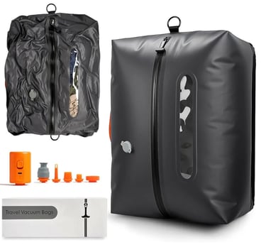 The Vacuum Travel Bags with Pump is an ideal solution for organizing clothes and saving space while traveling. This set includes two 34L bags and a hand pump to easily remove air, significantly reducing clothing volume for suitcases or backpacks.